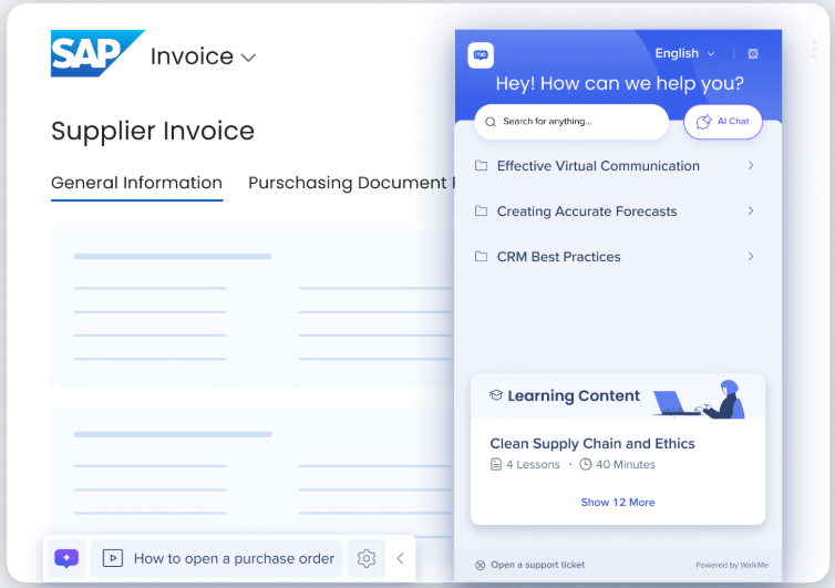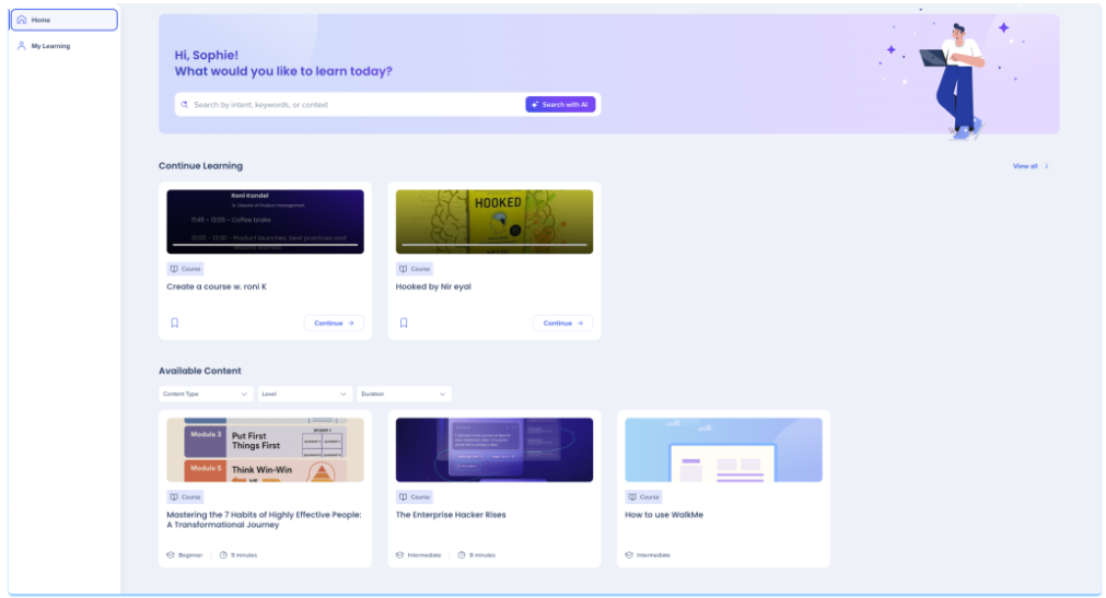 WalkMe Learning Arc transforme la formation passive en expériences d’apprentissage interactives et contextualisées. Il permet aux utilisateurs de créer et de diffuser des formations structurées directement dans les applications qu’ils utilisent au quotidien.