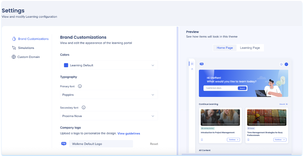 Personnalisez votre environnement d’apprentissage. La page Paramètres vous permet de configurer les simulations et la marque.