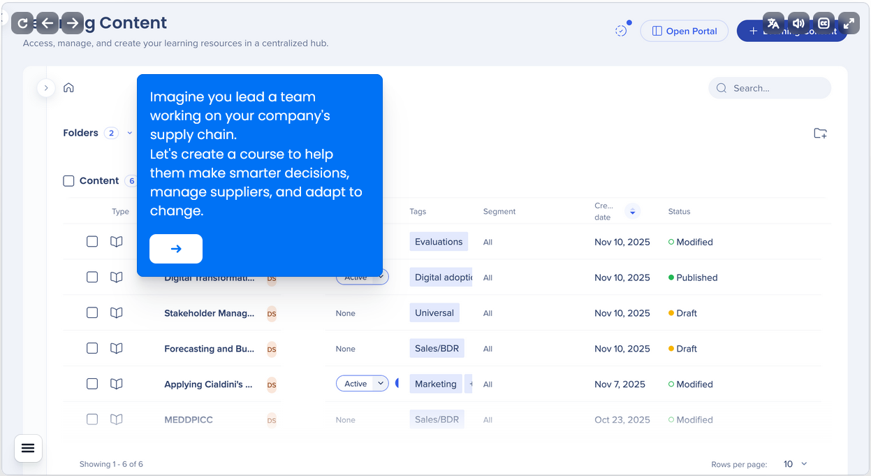 Créez et gérez des parcours d’apprentissage structurés. La page Contenu pédagogique vous permet de créer, modifier et organiser des cours grâce à un outil de création de cours flexible prenant en charge de multiples formats de contenu.